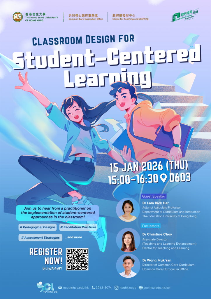 SCL Teaching Lab is an initiative of the project “Incorporating Student-Centered Learning (SCL) in the Common Core Curriculum of HSUHK”, funded by the Quality Enhancement Support Scheme (QESS) under the Self-financing Post-secondary Education Fund of the Education Bureau. (Project No. 03/QESS/2024)