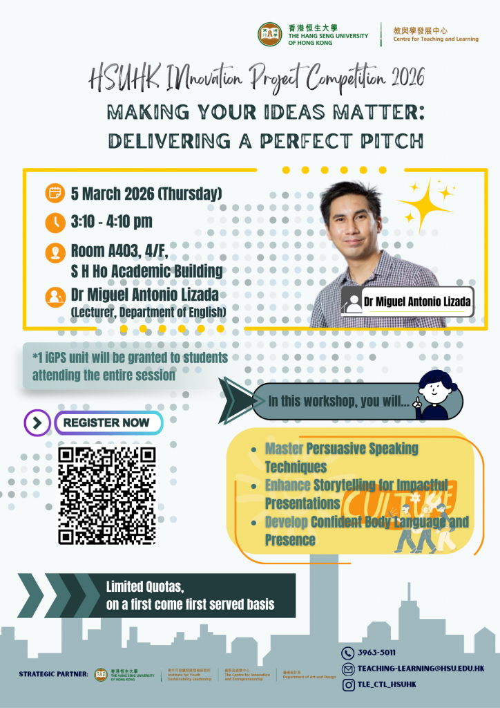 - HSUHK Innovation Project Competition 2024: InnoXplore Thursday – Pitch your Pitch (8 February 2024)